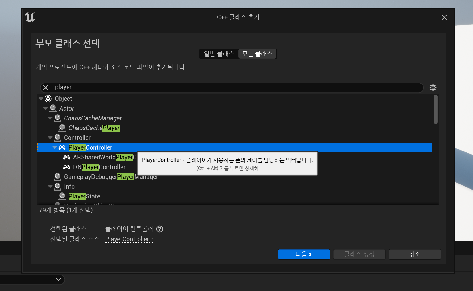 부모 클래스가 PlayerController인 플레이어 컨트롤러 클래스를 만들어줍니다.