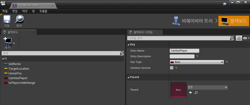 잠시 에디터로 돌아와서 블랙보드에 vector타입의 TargetLocation, bool타입의 CanSeePlayer 변수를 추가합니다.