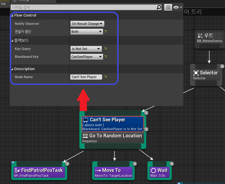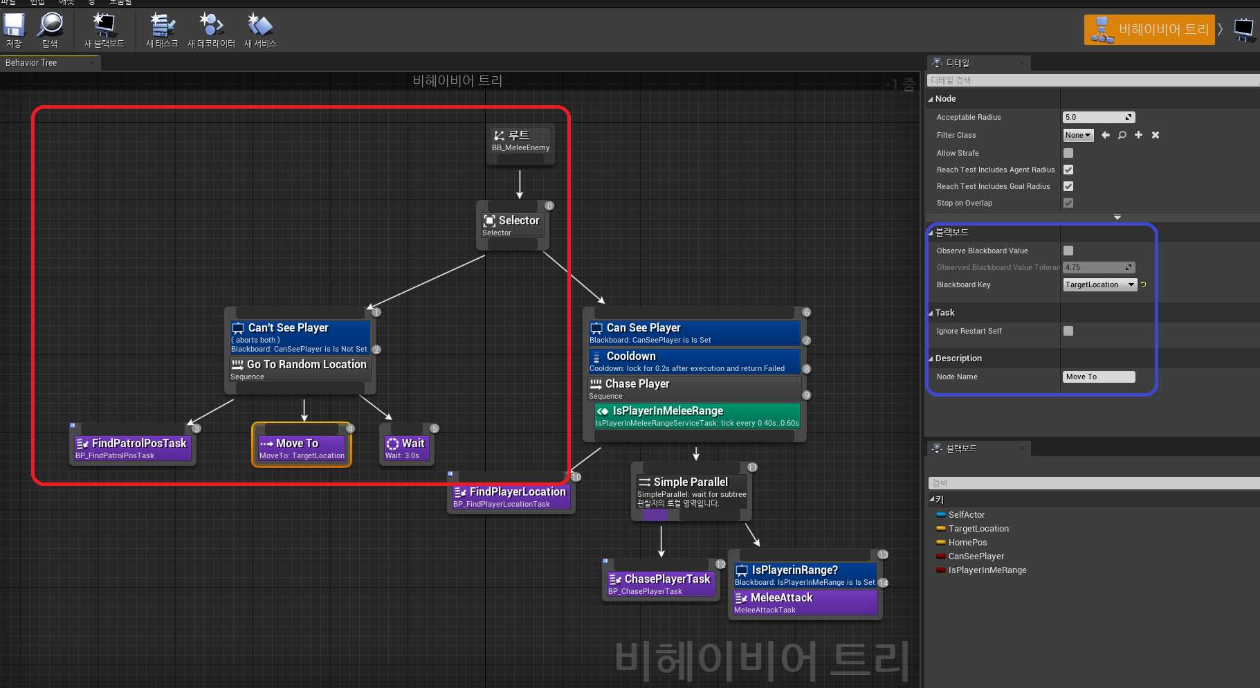 에디터상의 비헤이비어 트리에서 빨간 박스부분을 작성합니다.