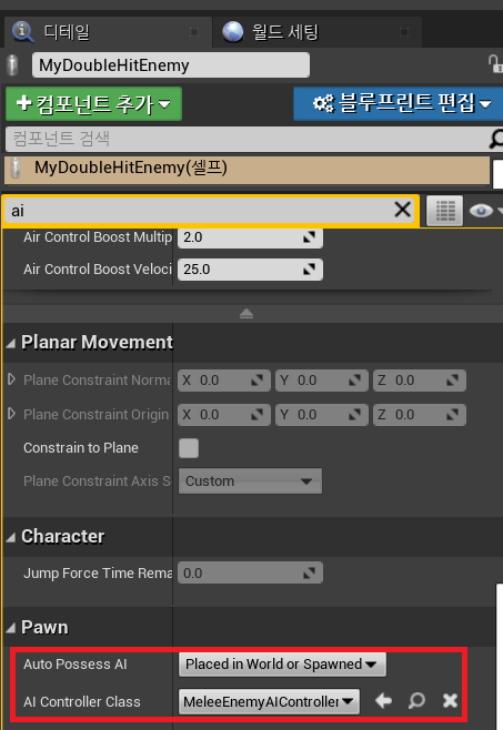 이제 에디터에서 몬스터클래스에 MeleeEnemyAIController를 설정해줍니다.